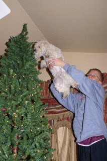 While they put the garland on, Chelsea brought out our two dancing stuffed Christmas animals and Tucker went nuts! While they danced, sang, and spun around, he jumped, barked and spun around. It was so funny. This picture doesn't do it justice.